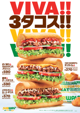 WATAMI FAST CASUAL MANAGEMENT株式会社(本社:東京都大田区)が展開するサンドイッチチェーン「サブウェイ」は、『メキシカンミートタコス』『濃厚チーズタコス』『ざく切りサルサタコス~爽やかライム~』の3種のサンドと、初登場となるライムフレーバーのポテト『コロコロポテト チリライム』を、2025年5月21日(水)から期間限定で全国のサブウェイにて販売いたします。