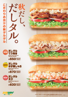 この秋、サブウェイで人気のタルタルソースが出汁のうまみと香りでパワーアップします。味の決め手となるのは、タマネギとピクルスの食感が心地よいタルタルソースに、新たに3種のかつお原料を贅沢に使用し秋らしい味わいを演出した『だしタルタル』。かつお出汁の上品な風味、香ばしい香り、そして奥深い旨みが重なり合い、具材の味わいを一層引き立てます。