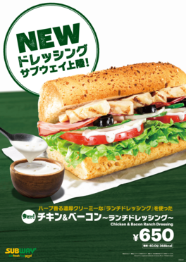 この春限定の濃厚クリーミ―なサンドが登場します。今回の注目は、サブウェイの本場、アメリカで最もポピュラーなドレッシングのひとつとされる「ランチドレッシング」。ランチドレッシングの“ランチ”とは昼食(Lunch)ではなく、牧場(Ranch)由来を意味しており、フレンチドレッシングをベースにした濃厚な味わいに、甘酸っぱさとハーブの爽やかな後味が特長です。アメリカの人気メニューを参考に、ジューシーなサラダチキンと香ばしいベーコンを組み合わせ、アクセントにはオリーブをトッピング。本場のおいしさと食べ応えを感じていただける仕上がりとなっています。
